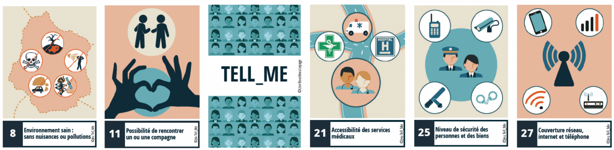 Tell_Me consists of a questionnaire and a set of 32 cards, each representing a territorial element that potentially contributes to the well-being of a person in his or her territory. A person solicited in the street takes 10 cards considered as the most important for his or her level of well-being to be the highest. They prioritize them and assign a value to them using tokens[iv].
