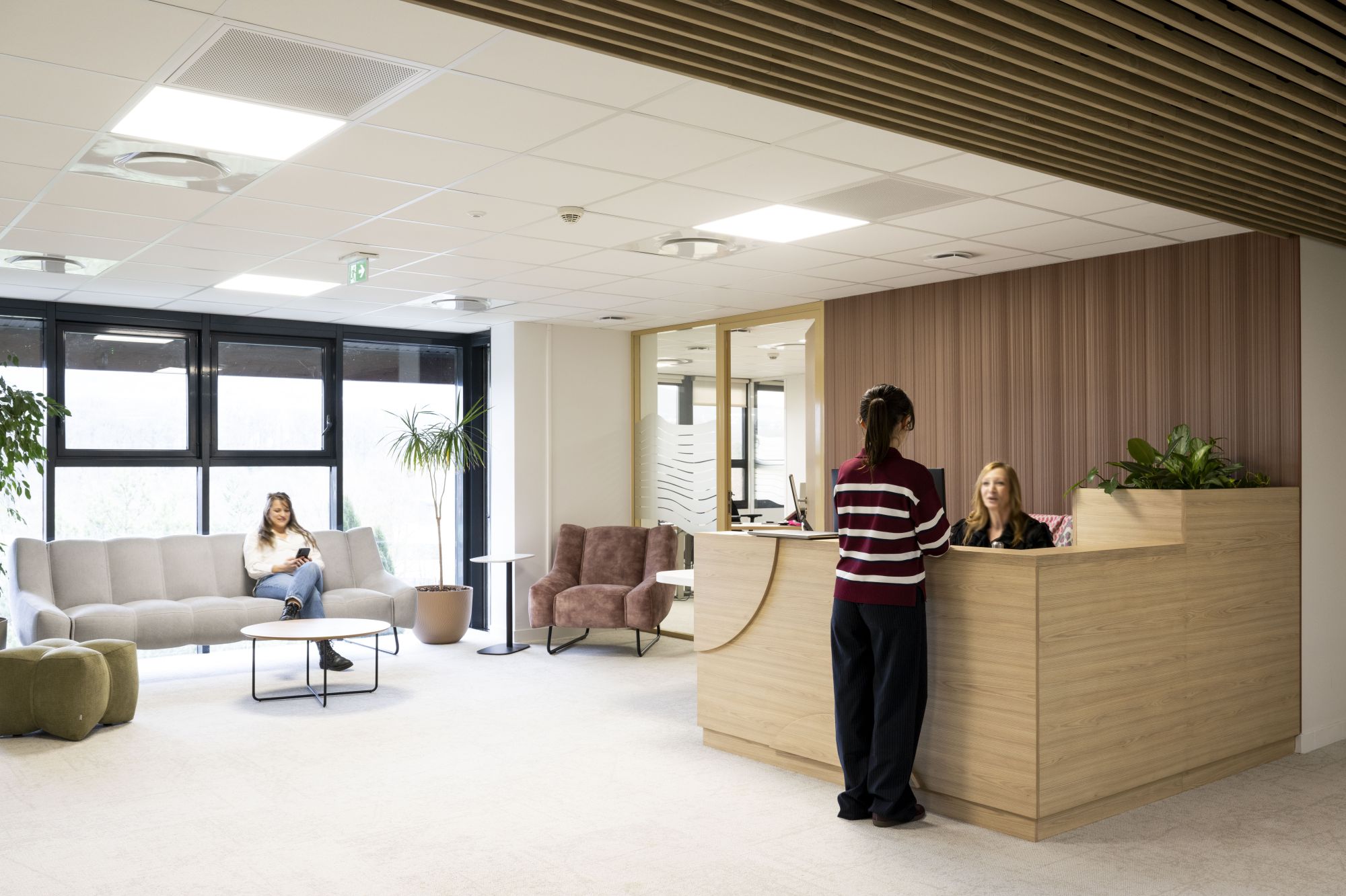 Le concept architectural développé par Kardham s’appuie sur une écriture contemporaine, chaleureuse et biophilique, directement inspirée de l’univers et de la charte d’I‑CAIR. Pensés comme un prolongement de la culture du Groupe, les espaces sont structurés par un langage architectural lisible et cohérent, fondé sur des plafonds bois en circulation, des éléments de mobilier et de rangement servant de repères, ainsi qu’une continuité visuelle affirmée entre les étages.